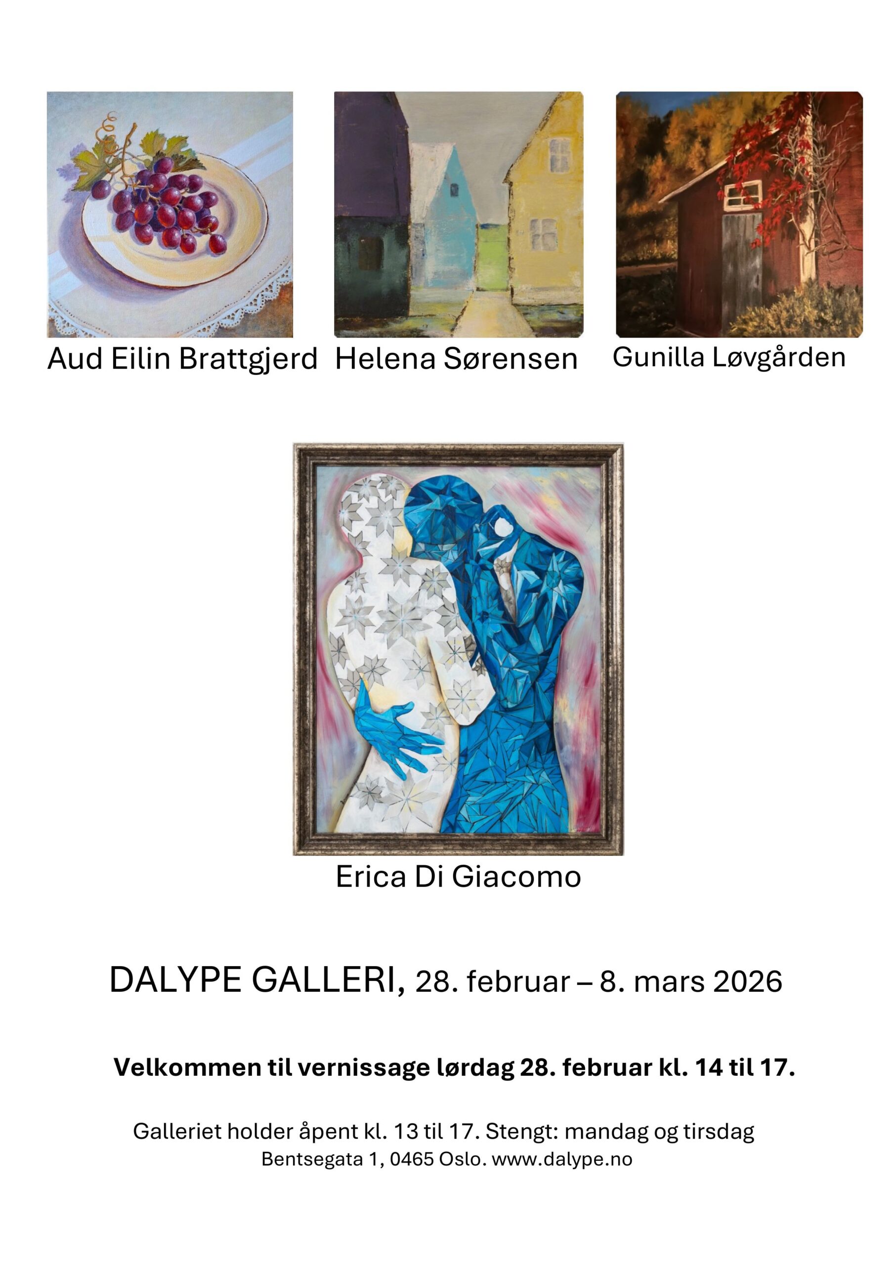 Nye maleriutstillinger i Dalype galleri på Sagene! FØRSTE ETASJEN: Aud Eilin Brattgjerd Helena Sørensen Gunilla Løvgården UNDERETASJEN: Erica Di Giacomo Åpning for utstillingene blir